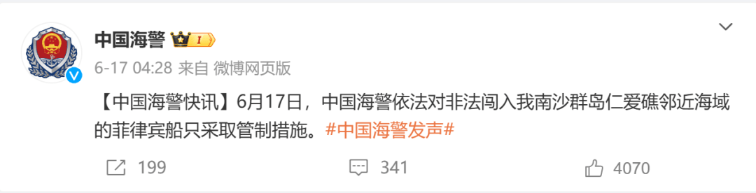 ——6月17日凌晨04:28分,中國海警官方微博説,“中國海警依法對非法闖入我南沙羣島仁愛礁鄰近海域的菲律賓船隻採取管制措施。”