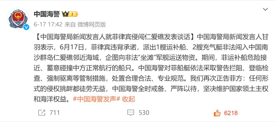 ——6月17日下午17:42分,中國海警官方微博放出了更多的信息,微博引述中國海警局新聞發言人甘羽的話説,6月17日,菲律賓違背承諾,派出1艘運補船、2艘充氣艇非法闖入中國南沙羣島仁愛礁鄰近海域,企圖向非法“坐灘”軍艦運送物資。期間,菲運補船危險接近、蓄意碰撞中方正常航行的船隻。中國海警對菲船艇依法採取警告攔阻、登臨檢查、強制驅離等管制措施,處置合理合法、專業規範。我們再次正告菲方:任何形式的侵權挑釁都徒勞無益,中國海警全時戒備、嚴陣以待,堅決維護國家領土主權和海洋權益。