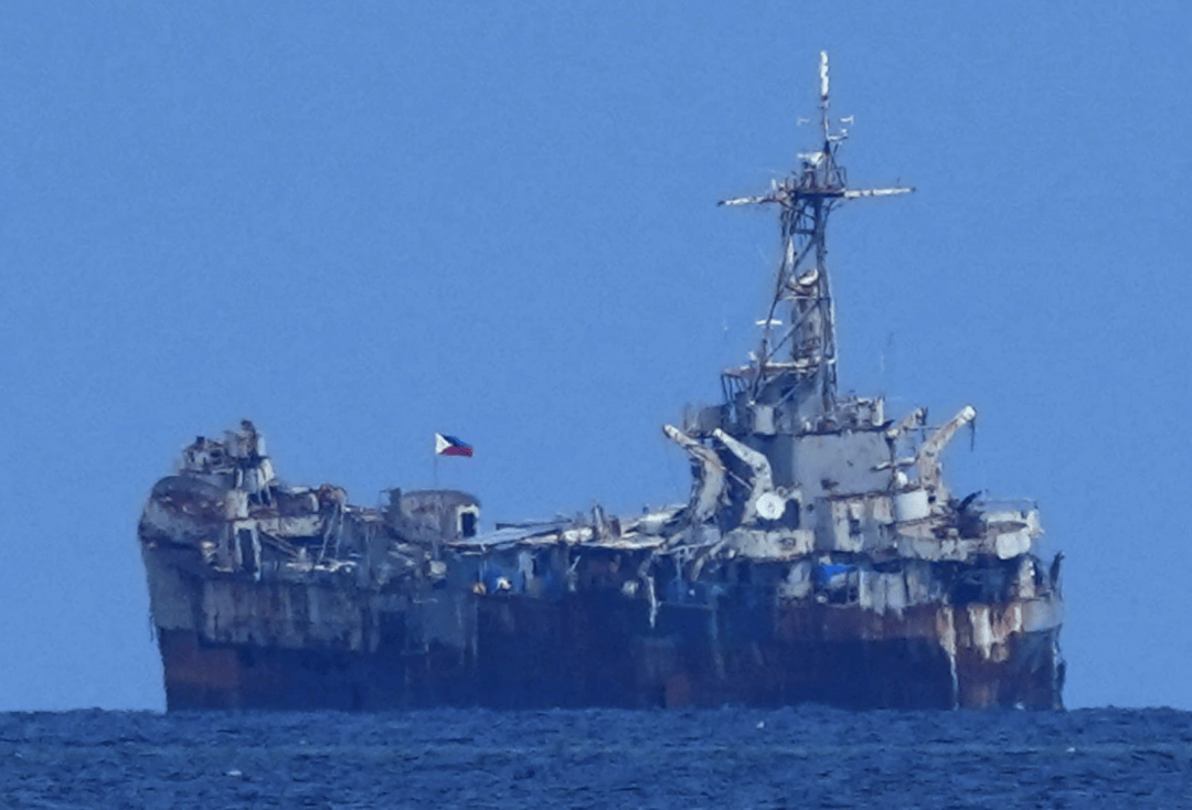 (上圖為菲律賓非法在中國仁愛礁坐灘的“破船”)
