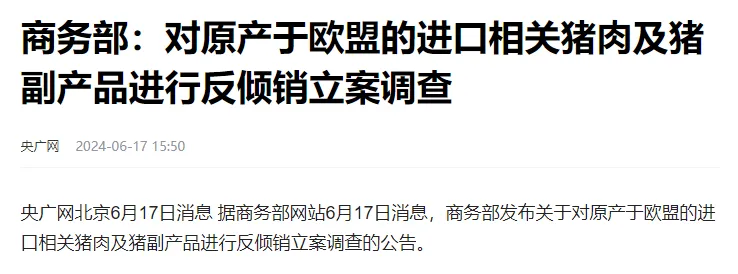 再來説另一個方向的反擊:消息大家都看到了,我們表示,將對原產歐盟的進口相關豬肉及豬副產品,進行反傾銷立案調查,一堆歐盟國家頓時坐不住了!