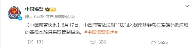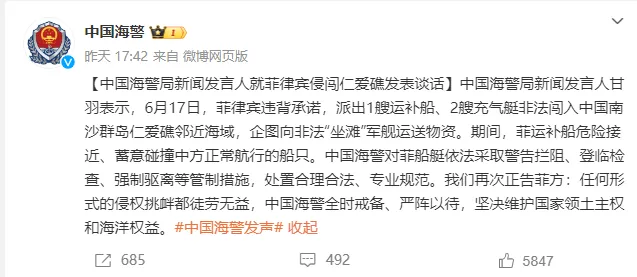 先是説:對非法闖入仁愛礁鄰近海域的菲律賓船,採取了管制措施。