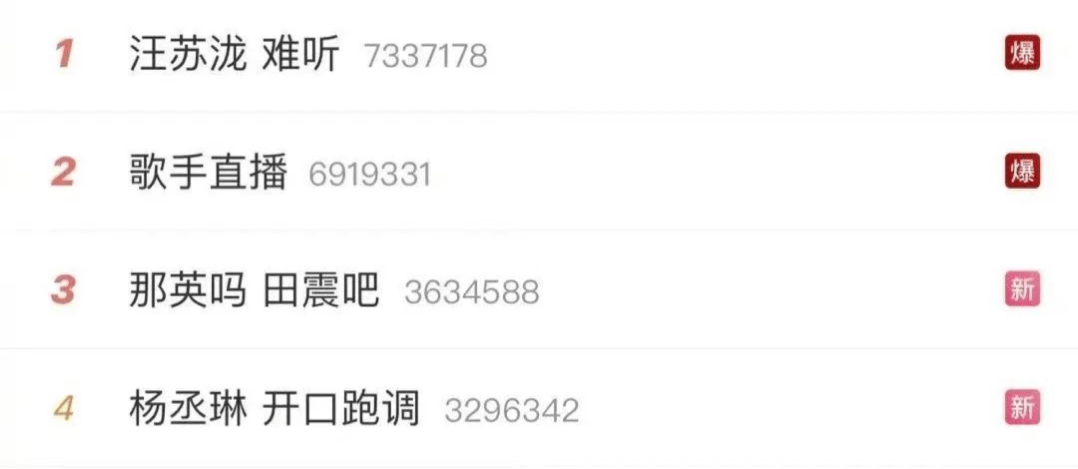 演出結束後,汪蘇瀧瞄了一眼主持人沈夢辰手裏的手機,熱搜詞條上,第一位就是無比顯眼的“汪蘇瀧,難聽”。