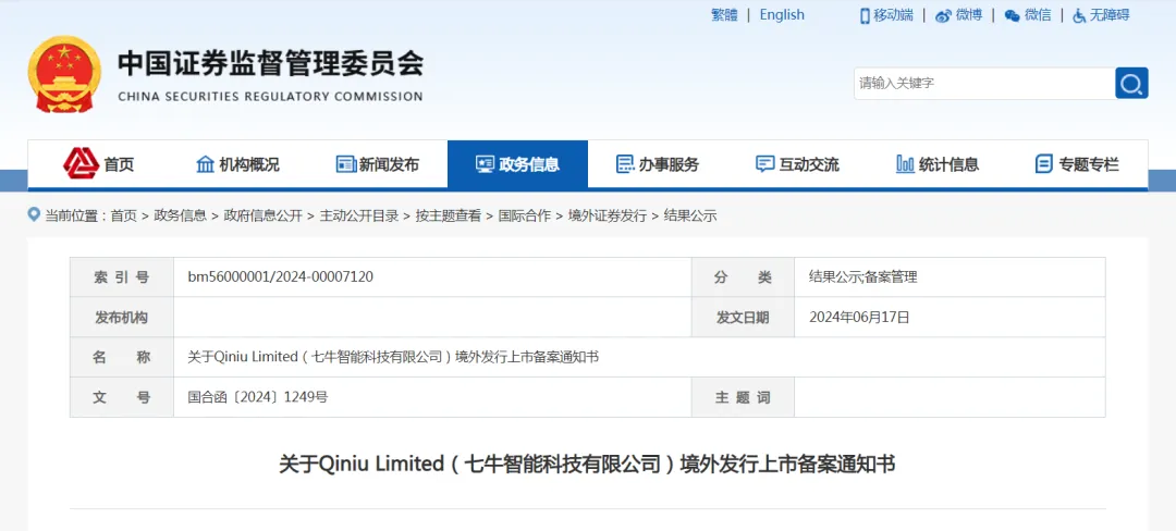 中國證監會網站發佈關於Qiniu Limited(七牛智能科技有限公司)境外發行上市備案通知書。七牛雲將計劃發行不超過234,715,000股普通股並在香港交易所上市。