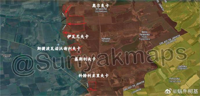 3、斯瓦託以西:俄軍沿整個前線推進,部分佔領了阿爾捷米夫卡和羅濟夫卡地區(如果不佔領熱列別茨河對岸的山丘,就不可能控制這些地區),此外還控制了新舍利夫斯克西部,開始向皮夏涅發起新的進攻。