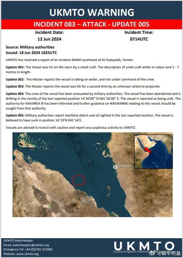 英國海上貿易組織正式報告Tutor號在紅海沉沒。