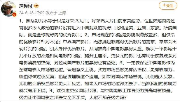 同時,賈樟柯指出,談引進更多國際片源,與中國電影工作者努力提高電影質量、努力讓中國電影走出去完全不矛盾,大家不都在努力嗎?