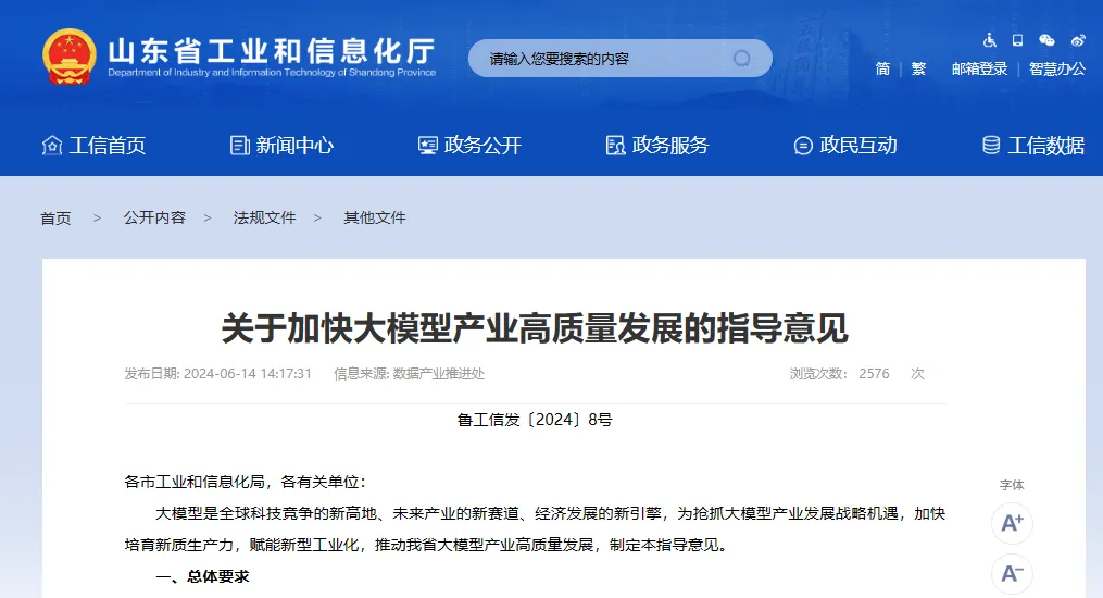 6月14日,山東省工信廳發佈**《關於加快大模型產業高質量發展的指導意見》**。