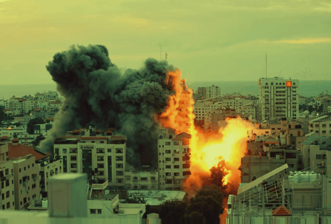 2023年10月7日以色列空軍轟炸加沙購物中心後的煙與火