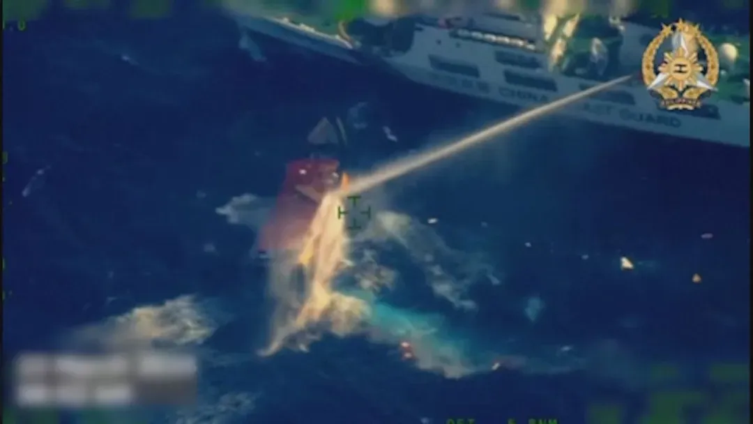 ▲此前中國海警利用水炮驅離非法運補船隻