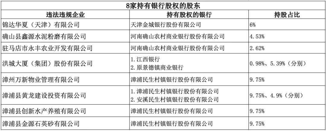 具體來看,此次被處罰的18家機構中,銀行股東包括錦達華夏(天津)有限公司(下稱錦達華夏)、駐馬店市永豐農業開發有限公司(下稱駐馬店永豐農業)、漳州萬新物業管理有限公司(下稱漳州萬新)等在內的8家公司。