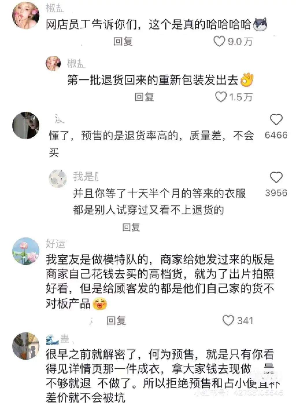 二是你買的衣服根本就還沒做,商家先掛個圖預售幾天看銷量,賣得好找工廠下大貨,沒啥人買就乾脆不生產了,讓顧客退款。