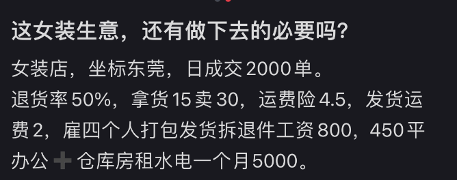 拿貨15賣30,50%的毛利率,聽起來挺可觀的,但如果算上50%的退貨率,就相當於1000件的利潤要覆蓋2000件產生的成本。