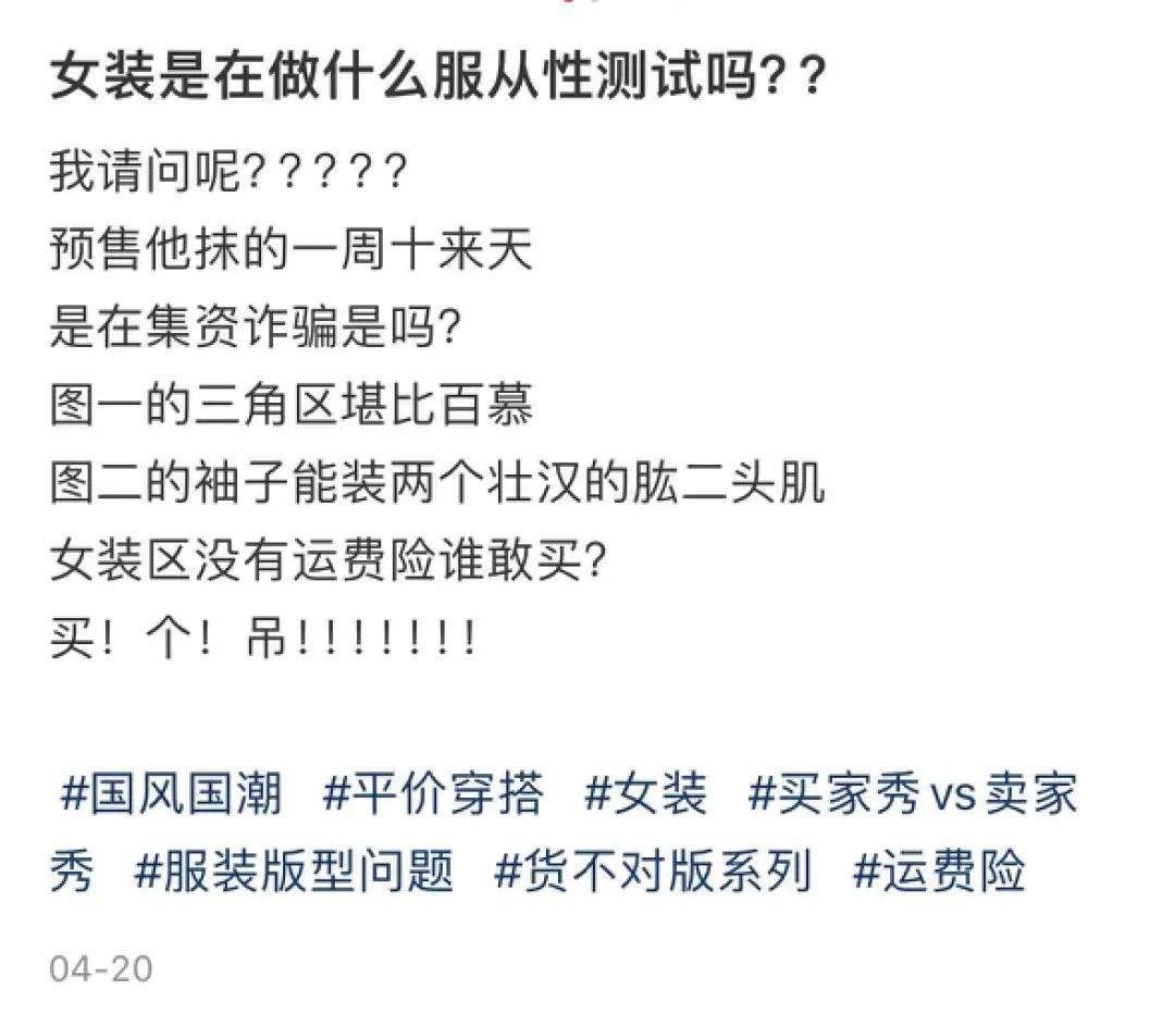 這些因素疊加,造就了一個消費者完全看不懂的女裝市場:發貨時間超長,賣得又貴,收到的東西還動不動就很差。