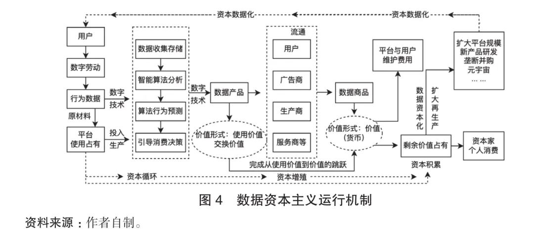 資本數字化既以數字經濟的崛起為前提,又是對數字領域的進一步促進和發展。資本通過數據的生產與再生產,不斷擴大資本再生產,為了最大限度獲取數據的價值和利潤,資本不斷流向數據生產領域,數據成為資本的寄居之所。馬克思提出 :“把剩餘價值當做資本使用,或者説,把剩餘價值再轉化為資本,叫做資本積累。”**隨着數字平台將廣泛的經由用户數字勞動產生的數據投入數據商品生產並私有化數據商品價值,數字平台完成了數據資本化的過程。**在佔有數據資本的基礎上,資本為進一步保證數據要素的無限供給而走向了資本數據化階段。