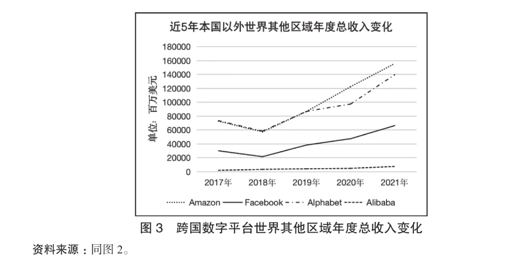 跨國數字平台不滿足於其國內的市場份額,不斷向全球擴張。具體可以體現在近五年超級數字平台在世界範圍內員工總人數的增加(圖2)與本國以外世界其他區域年度總收入的增加(圖3,其中Facebook 統計為美國和加拿大以外的地區)。這種擴張從經濟發達國家到發展中國家,形成數據霸權。數字空間與數據資源取代了過去的地理空間與自然資源,成為數字殖民主義征服、控制與攫取的新對象。平台通過確保沒有競爭對手比它們做得更好而得以生存,因此它們試圖確保自己是全球所有角落特定服務的唯一選擇。他們的目標是獲取更多、更好的數據,作為一種資源,以與“歷史殖民主義的掠奪性開採行為”沒有太大區別的方式出售。通過世界範圍的數據壟斷,跨國數字平台在世界範圍內獲得了更多超額壟斷利潤。最終,在這場數據資源爭奪戰中,超級數字平台大獲全勝,數據資本加速擴張,資本再生產不斷擴大。