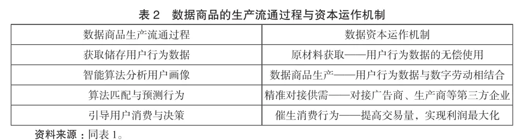 馬克思指出:“資本主義生產不僅是商品的生產,它實質上是剩餘價值的生產。”前文述及,對於觀察數據,平台擁有訪問、使用和控制的權利,這是平台生產數據商品的前提。在數據商品生產的第二階段,平台將用户與其生產的數據相分離,由於用户不佔有生產資料,無法參與數據商品生產的全過程,平台自然就佔有了用户數字勞動的剩餘價值。那麼,數據商品形式如何能突破傳統的資本剝削路徑,成為資本實現價值積累的新形式呢?