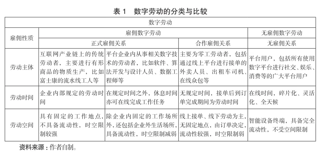 英國馬克思主義理論家克里斯蒂安·福克斯對數字勞動做了深入的研究,並認為數字勞動是我們理解互聯網的政治經濟學的一個基礎概念。福克斯理論體系中的數字勞動內涵豐富,他把所有涉及到數字媒介的體力勞動與腦力勞動均劃分到數字勞動範疇,而資本剝削正是通過數字勞動得到加強。通過對現有研究的總體考察,數字勞動按照僱傭性質可劃分為僱傭數字勞動和無僱傭數字勞動。僱傭數字勞動是生產經營數據的勞動,非僱傭數字勞動包括生產個人數據、中間數據與公共數據的勞動。其中,僱傭數字勞動分為兩類:一類是存在於企業內部並與企業簽訂了正式勞動合同的勞動者,此類屬於正式的僱傭關係,企業要支付其工資併為其繳納社保,另一類是與平台之間存在非正式的僱傭關係或合作關係的數字勞動者,這類勞動者一般沒有基本工資,通常按單計費,且大多無法得到相應的社會保障。僱傭數字勞動是一種有酬數字勞動,無僱傭數字勞動是無僱傭關係的無酬數字勞動。按照上述分類,本文對不同類型的數字勞動進行了具體探討與比較,如表1所示。