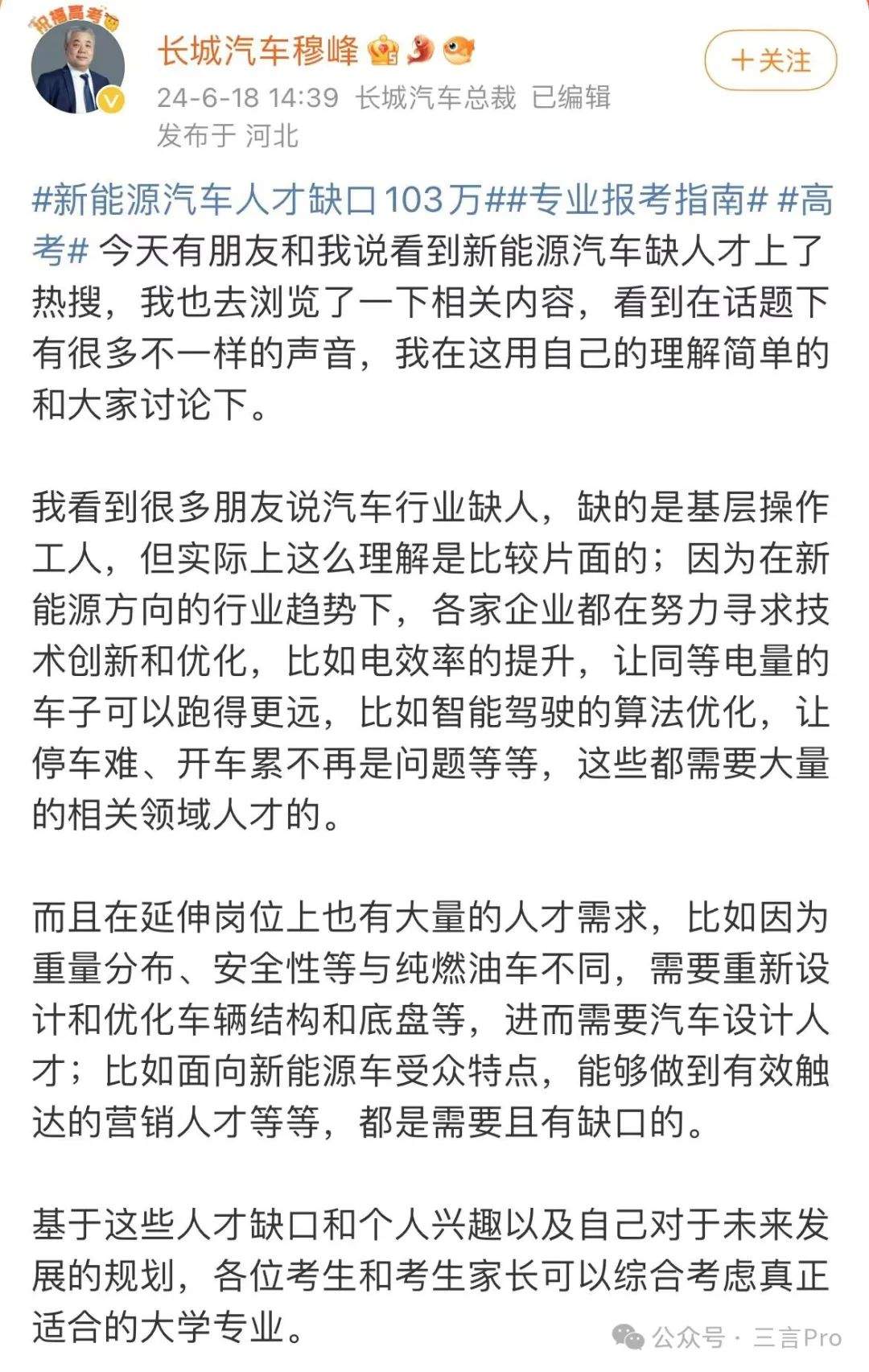 長城汽車總裁穆峯發文稱,他看到很多朋友説汽車行業缺人,缺的是基層操作工人,但實際上這麼理解是比較片面的;因為在新能源方向的行業趨勢下,各家企業都在努力尋求技術創新和優化,比如電效率的提升,讓同等電量的車子可以跑得更遠,比如智能駕駛的算法優化,讓停車難、開車累不再是問題等等,這些都需要大量的相關領域人才的。