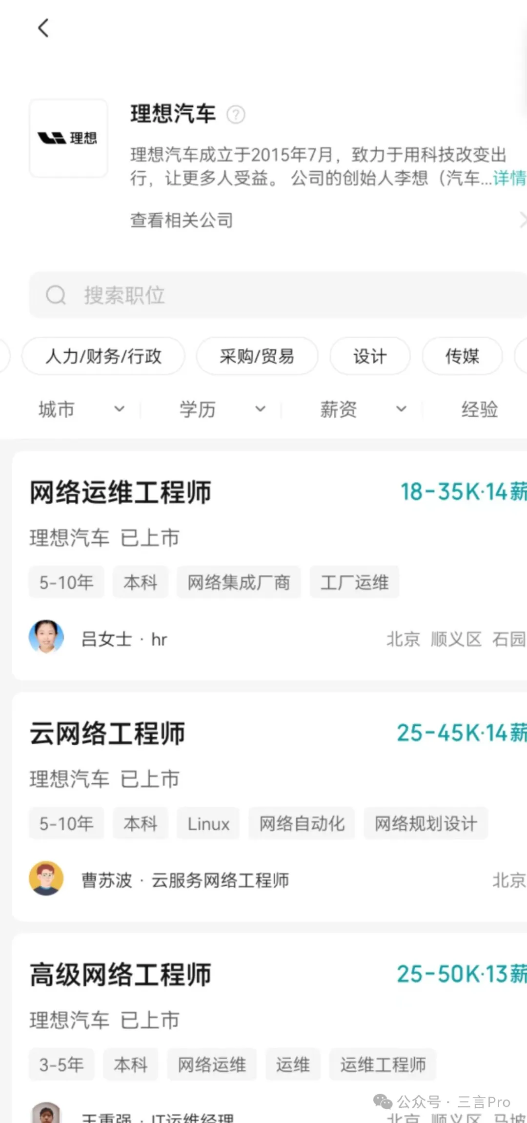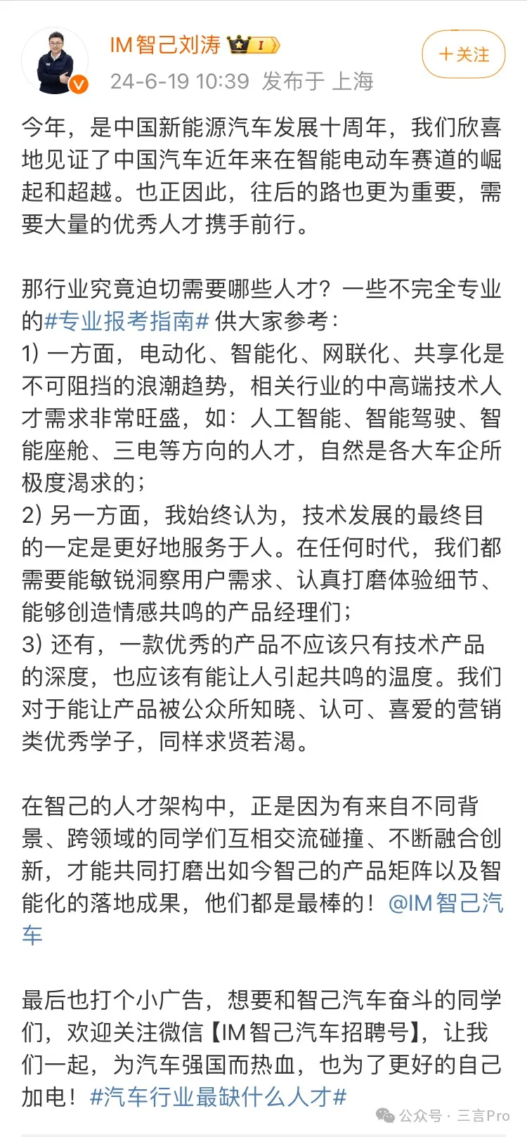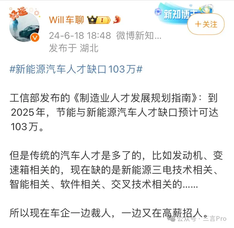 博主“Will車聊”稱。傳統汽車人才是多了的,而現在缺的是新能源三電技術相關、智能相關、軟件相關以及交叉技術相關的。