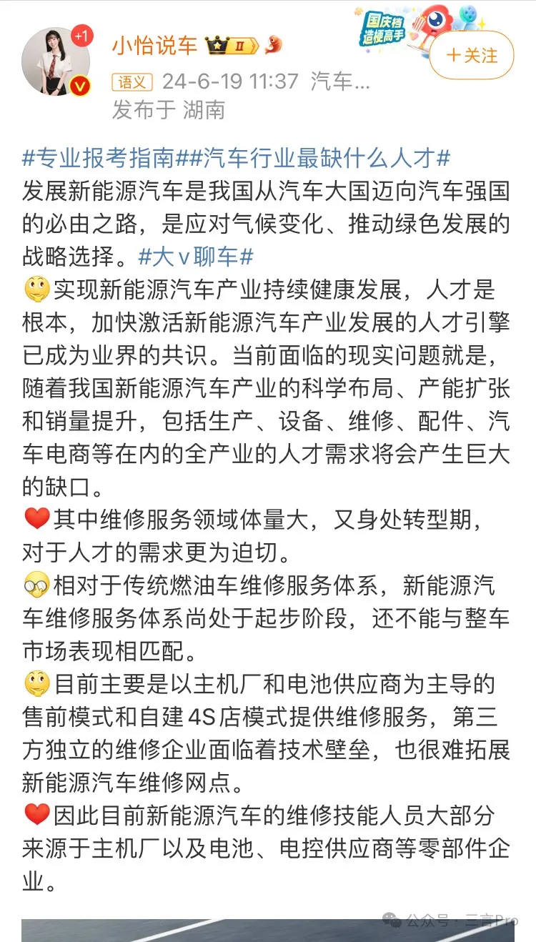 汽車博主“小怡説車”認為,隨着新能源汽車產業發展,包括生產、設備、維修、配件、汽車電商等在內的全產業人才需求將會產生巨大缺口。其中,維修服務領域體量大,又身處轉型期,對於人才需求更為迫切。