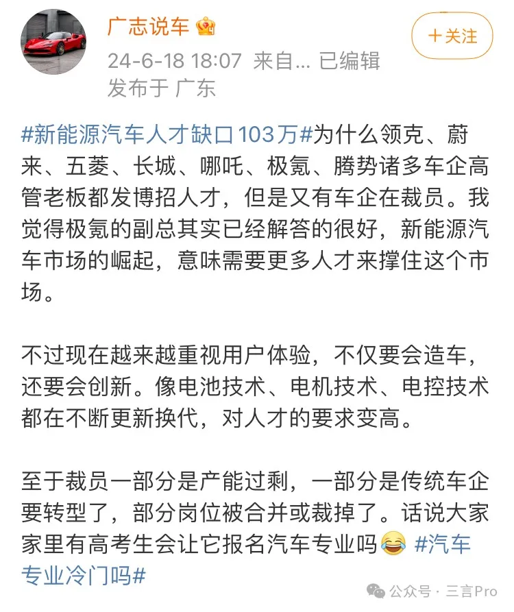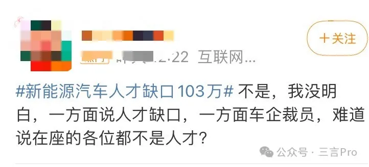 但也有網友質疑稱,既然新能源人才缺口這麼多,為何屢傳車企裁員?
