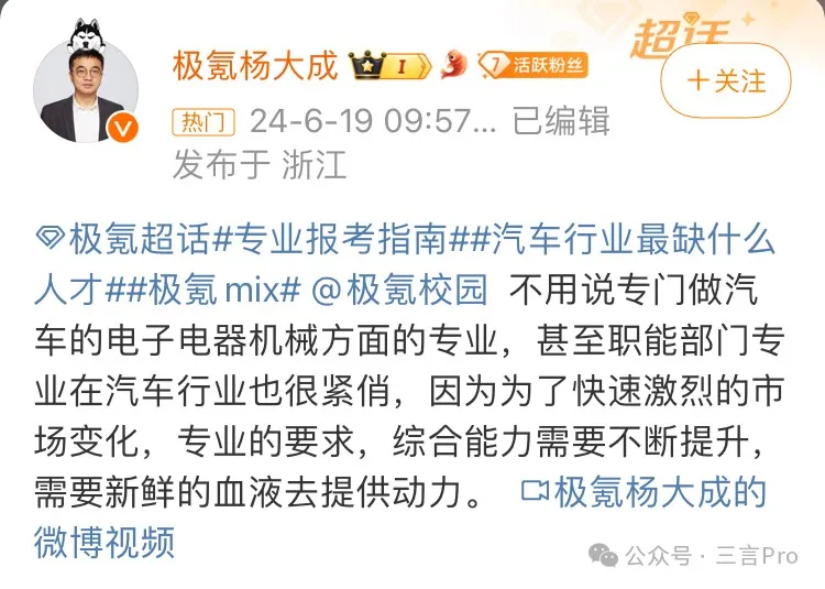 極氪智能科技副總裁楊大成認為,專門做汽車的電子電器機械方面專業人才、職能部門專業人才在汽車行業都很緊俏。