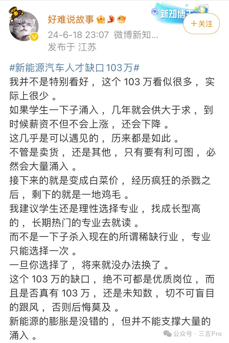也有博主並不看好“103萬人才缺口”,他表示這個看上去很多,其實很少;如果學生大量湧入,幾年就會造成供大於求,到時薪資待遇不僅不會上漲,還會下降。