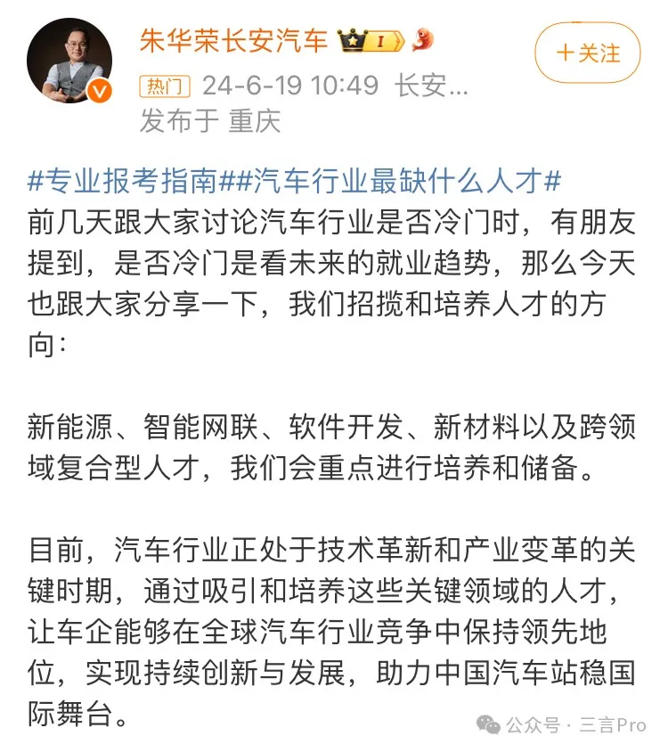 長安汽車董事長朱華榮指出,新能源、智能網聯、軟件開發、新材料以及跨領域複合型人才會重點進行培養和儲備。