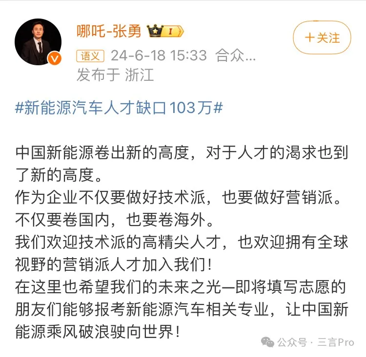 哪吒汽車CEO張勇表示,中國新能源對於人才的渴求到了新的高度,企業不僅要做好技術派,也要做好營銷派,不僅要卷國內,也要卷海外。