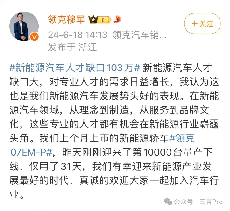 對於新能源汽車人才缺口達103萬一事,行業內多位大佬均發表了各自看法。