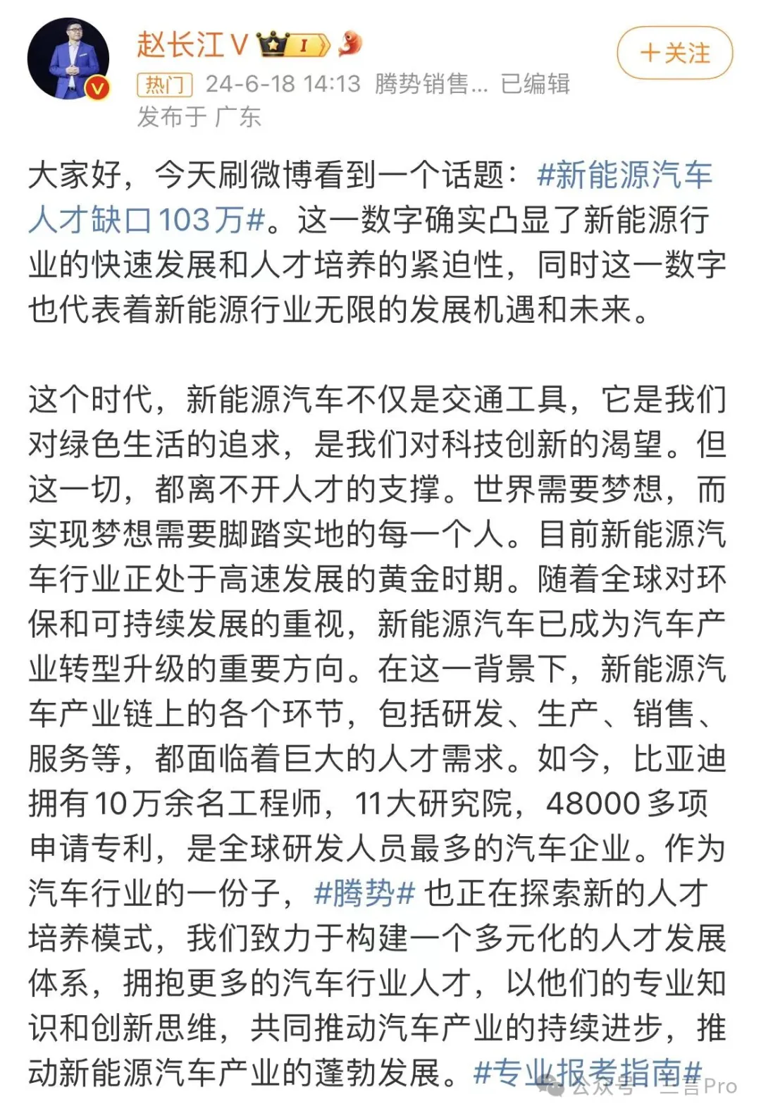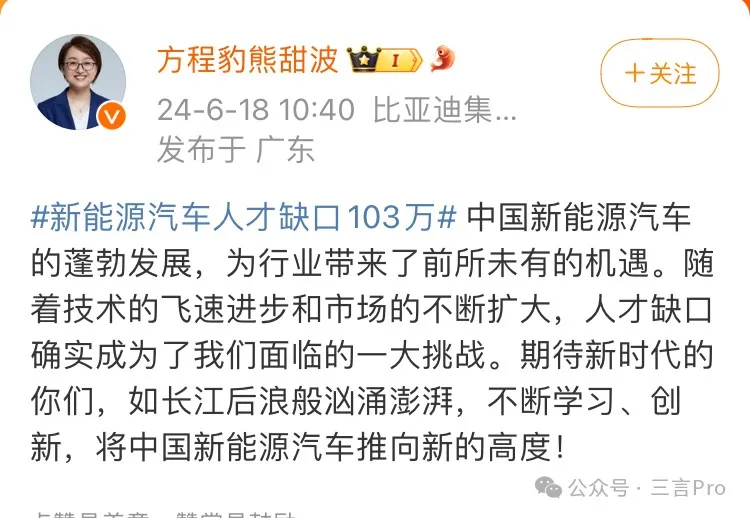 騰勢銷售事業部總經理趙長江發文稱,新能源汽車人才缺口103萬,這一數字確實凸顯了新能源行業的快速發展和人才培養的緊迫性,同時這一數字也代表着新能源行業無限的發展機遇和未來。