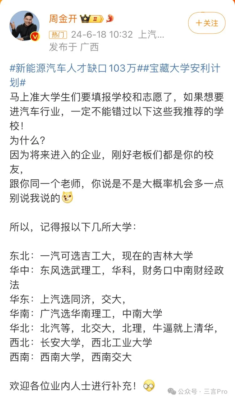 上汽通用五菱品牌事業部副總經理周金開直接了當的向所有剛參加完高考的考生們推薦大學,比如一汽可選吉林大學,東風選武理工,上汽選同濟、上交大,廣汽選華南理工、中南大學,北汽選北交大、北理、清華等。