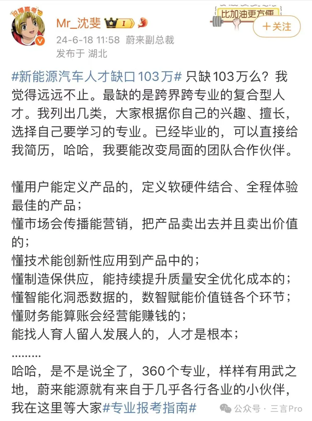 蔚來副總裁沈斐發文稱,他認為新能源汽車人才缺口遠遠不止103萬。最缺的是跨界跨專業的複合型人才。