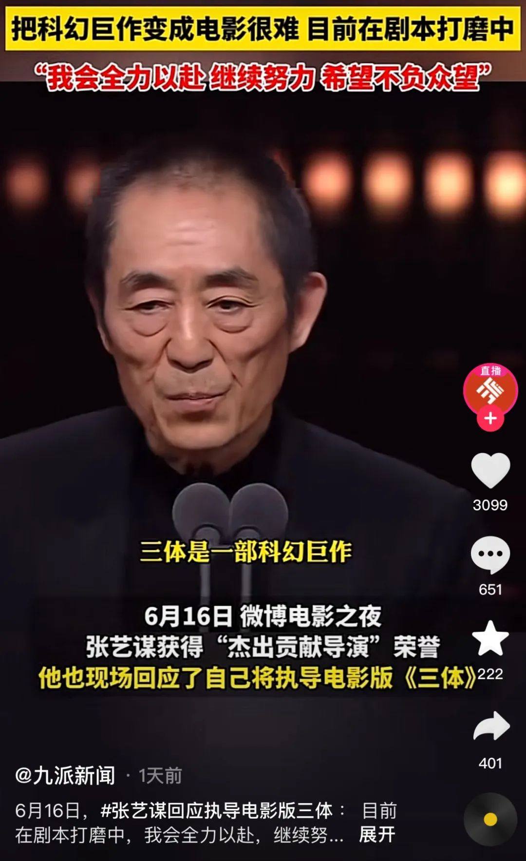 哦莫,聽了這段張藝謀答記者問“拍一個科幻題材需要些什麼”,懷疑他還沒開始看《三體》。老謀子對科幻的理解,感覺還停留在硬糖君小學寫作文《暢想2030年人類發展》什麼的。