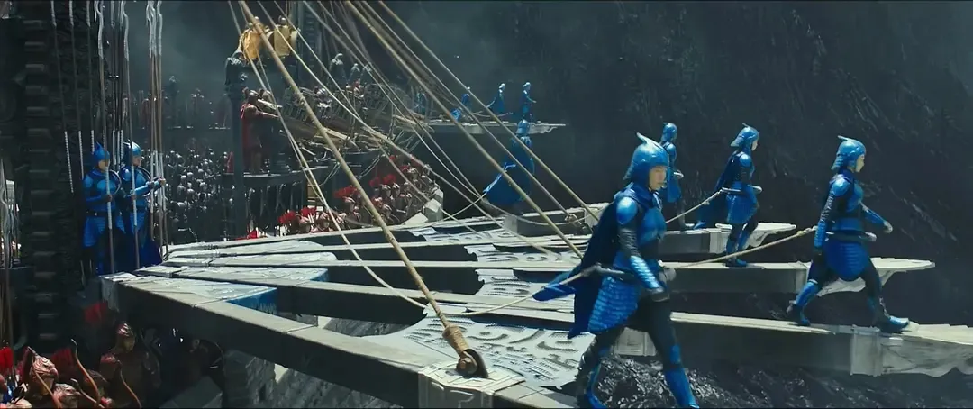 **《三體》的要旨是“物理學不存在了”,而在老謀子的電影宇宙裏“物理學從未存在”。**當我們回看世紀之交的張藝謀作品,會發現頂級的色彩美學,而這剛好是廢土科幻的短板。無垠的太空怎能只有黑白灰,老謀子給你整點大紅撞大綠,黃金甲大戰黑飛船。三體艦隊也在裝飾上下足功夫,用赤橙黃綠青藍紫七色戰艦駛向地球。