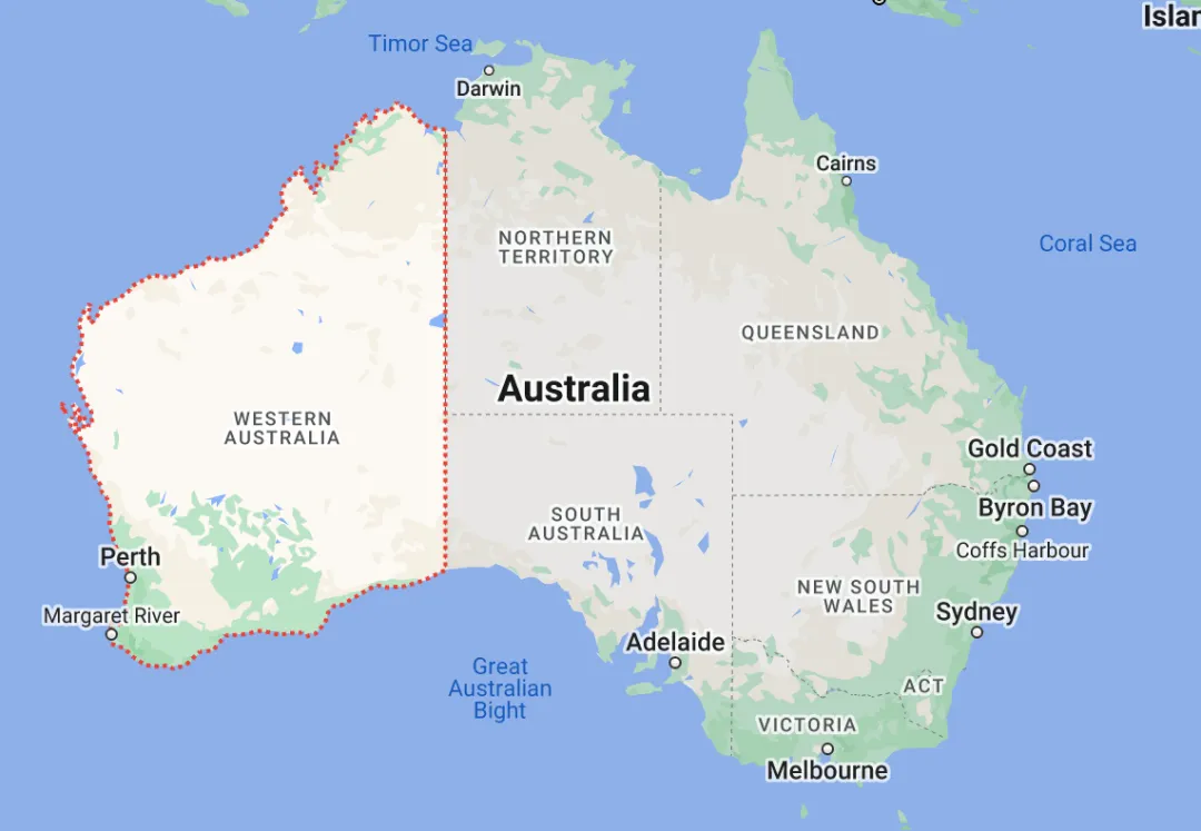 澳大利亞是世界第六大的國家,然後他們整個西邊都屬於“西澳大利亞州”,從地圖上看是這樣: