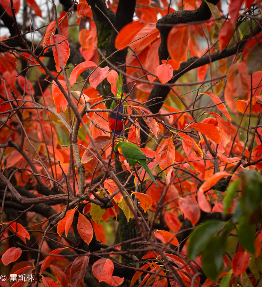 柿葉火紅,鸚鵡翠綠,霎是好看。
