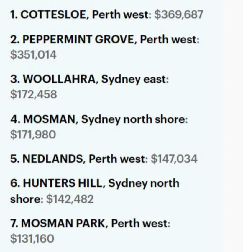 第一名的cottesloe區域,平均年收入達到驚人的37萬澳元,合180萬人民幣。這不是什麼財富排行榜,而是所有人的平均收入,令人咋舌。