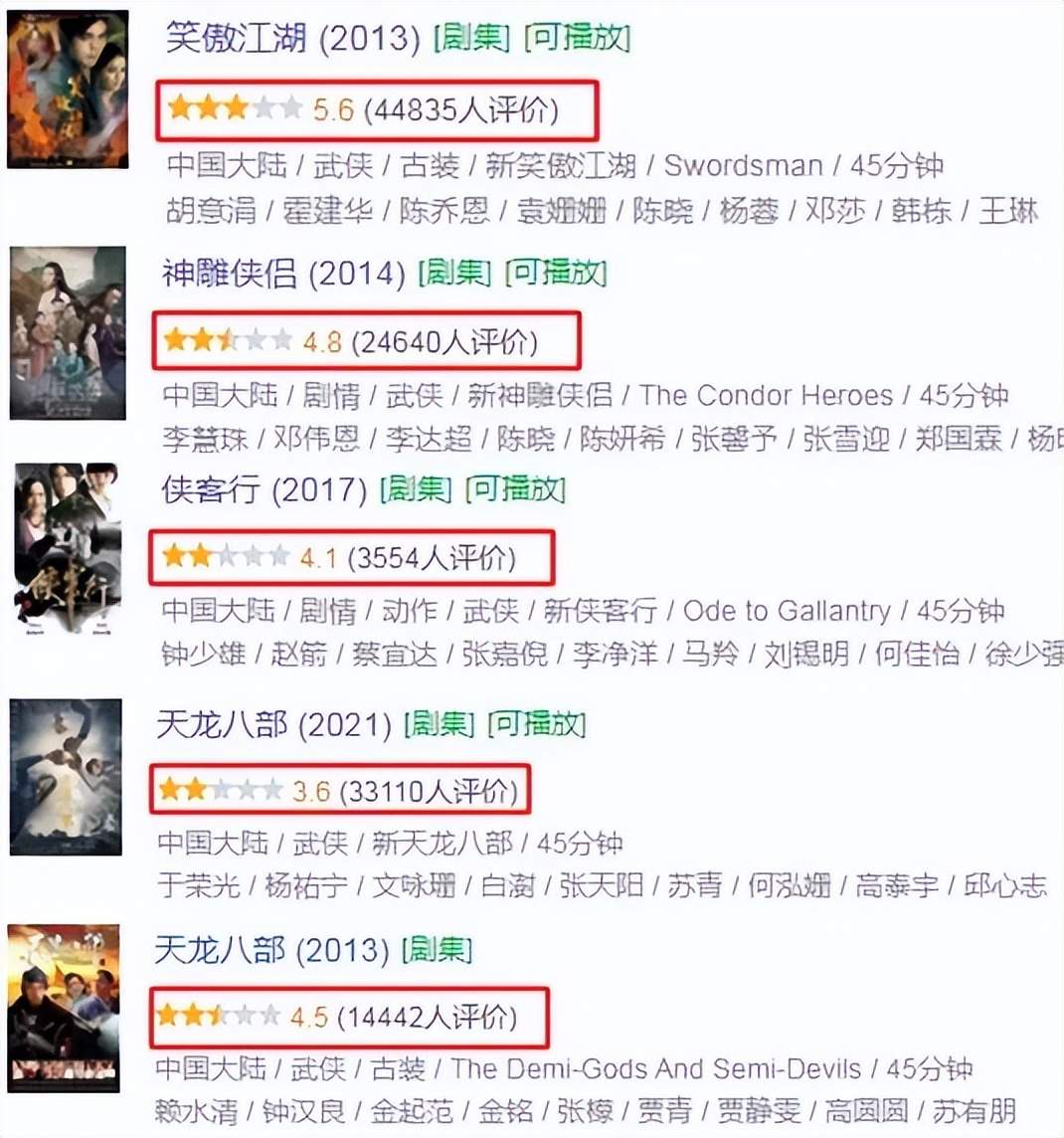 從2017年《射鵰英雄傳》播出以來,是新一輪的金庸武俠改編熱潮,這一階段可謂爛劇氾濫,除了17版《新射鵰》口碑尚可,成功捧出了李一桐,大部分劇口碑與收視雙撲,包括豆瓣評分2.5分的《新笑傲江湖》、3.3分的《鹿鼎記》、3.4分的《天龍八部》……