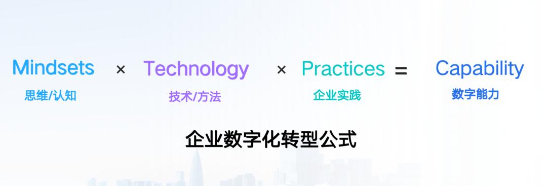 其次,AI時代企業數字化轉型的根本要掌握系統性轉型方法。企業在數字化轉型和建設的過程當中,看到問題只針對局部問題做數字化是不行的。完整的轉型思路則是從企業自己的思維認知、技術方法、實踐方面思考——思維認知×技術方法×企業實踐,最終能構成企業的數字能力。