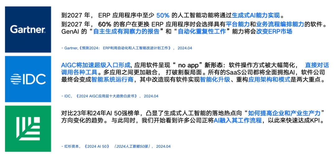 Gartner\IDC\紅杉資本等海外研究機構給出了一定的答案。Gartner在2024年4月《預測2024:ERP利用自動化和人工智能改進計劃工作》中預測,到2027年,ERP應用程序中至少50%的人工智能功能將通過生成式AI能力實現。