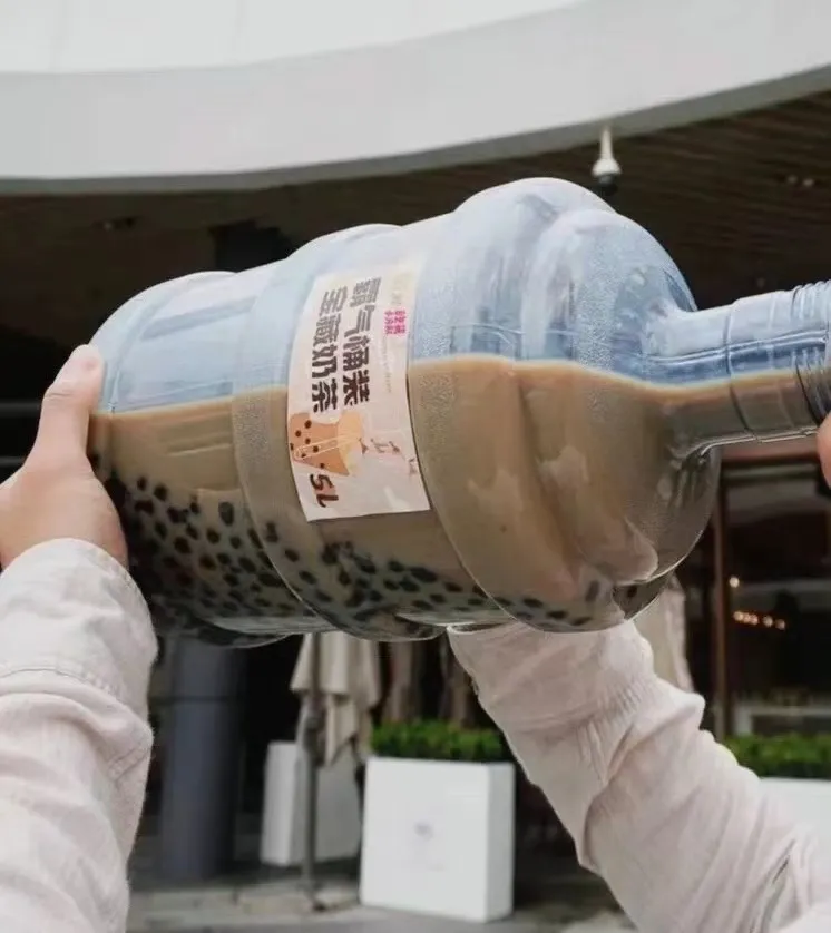 奈雪的茶曾推出5L裝“霸氣桶裝寶藏奶茶”,限時限地限量,售價99元/桶,據説珍珠和奶茶用量是正常杯裝的10倍。