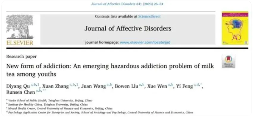 2023年,清華大學研究團隊在《情感障礙雜誌》(Journal of Affective Disorders)發表了一項“關於喝奶茶對人心理健康各方面的潛在影響”的研究。