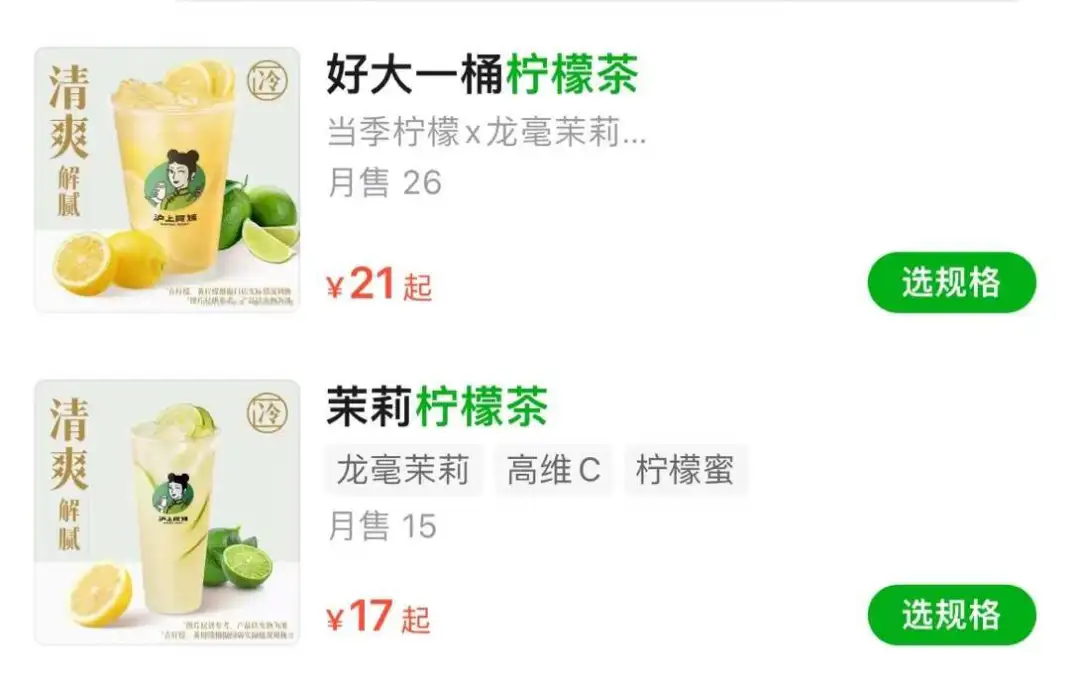 比如滬上阿姨一份標準杯的檸檬茶是700mL,一大桶則是1000mL,算下來分別是0.024元/mL和0.021元/mL。