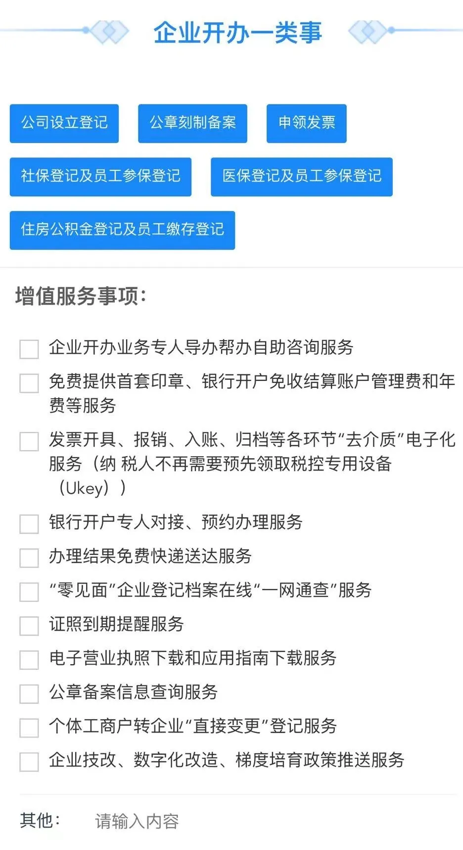 如何在線享受增值服務?工作人員展示了操作流程。企業登陸“浙裏辦”APP平台就可以搜索到“湖企辦”,找到“一類事專區”,如果你是辦理企業開辦,頁面頂部藍色部分所顯示的“公司設立”“參保登記”等都是基本服務,企業還可以在下面菜單中勾選“證照到期提醒”“選址智能推送”“銀行開户專人對接”等增值服務。