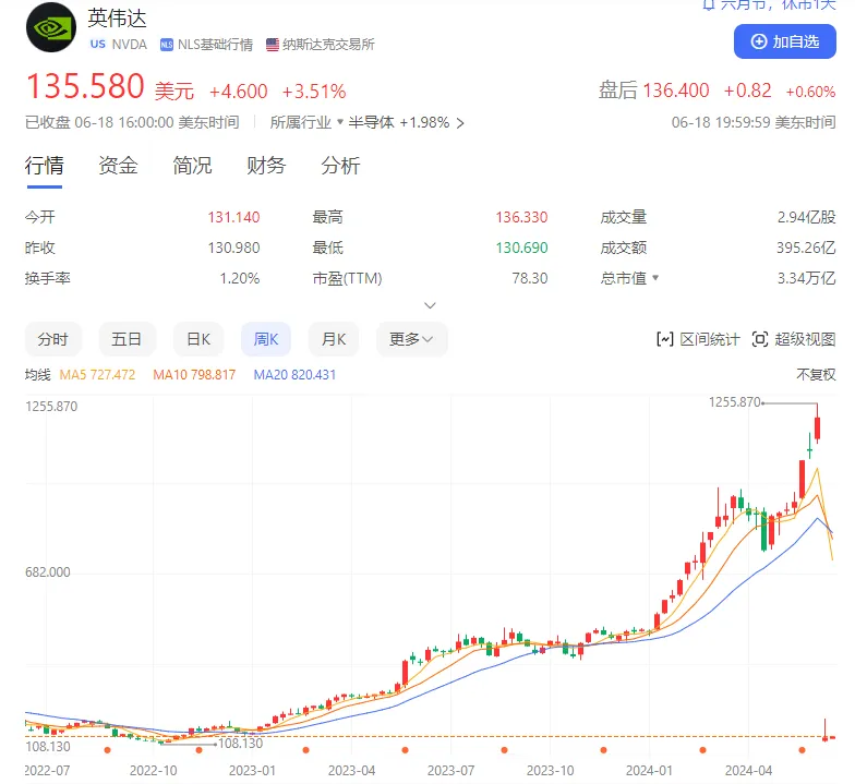 美東時間6月18日16點,英偉達收盤價固定在135.580美元,上漲3.51%,總市值達3.34萬億美元,超越微軟,成為全球市值最高的上市公司,英偉達CEO黃仁勳的身價也隨之突破1160億美元,位列全球富人榜的第十一位。