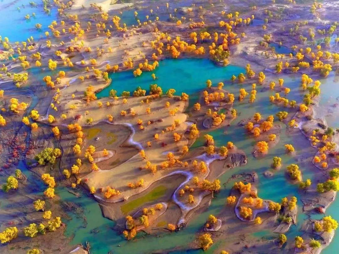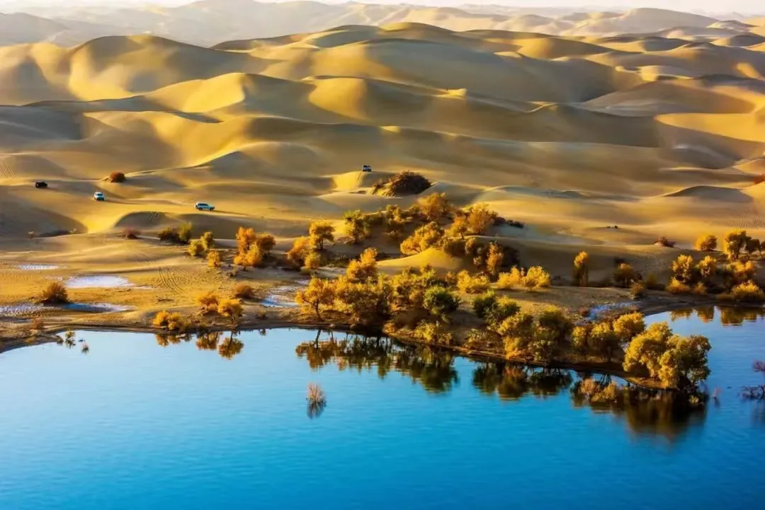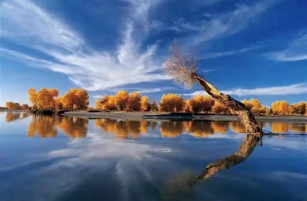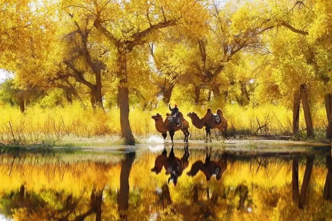 金色的胡楊林與藍天、大漠、水鳥、湖泊交相輝映,讓人忘卻城市的喧囂,一呼一吸之間盡是大自然的饋贈。