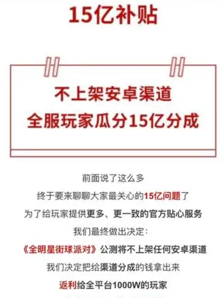 而在中國市場上,以騰訊、網易、米哈遊、莉莉絲為代表的一系列廠商早已向安卓渠道開炮。包括《原神》《崩壞:星穹鐵道》《萬國覺醒》《全明星街球派對》等產品都沒有上過安卓渠道。其中網易的《全明星街球派對》甚至是打出了“不上安卓渠道,全服玩家瓜分15億分成”的口號。