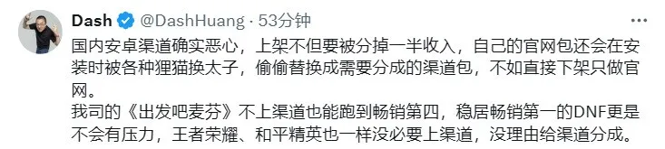 他表示:“(在國內安卓渠道)上架不但要被分掉一半收入,自己的官網包還會在安裝時被各種狸貓換太子,偷偷替換成需要分成的渠道包,不如直接下架只做官網。我司的《出發吧麥芬》不上渠道也能跑到暢銷第四,穩居暢銷第一的DNF更是不會有壓力,王者榮耀、和平精英也一樣沒必要上渠道,沒理由給渠道分成。”