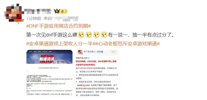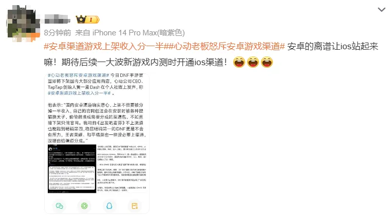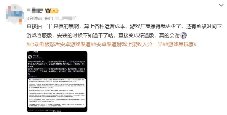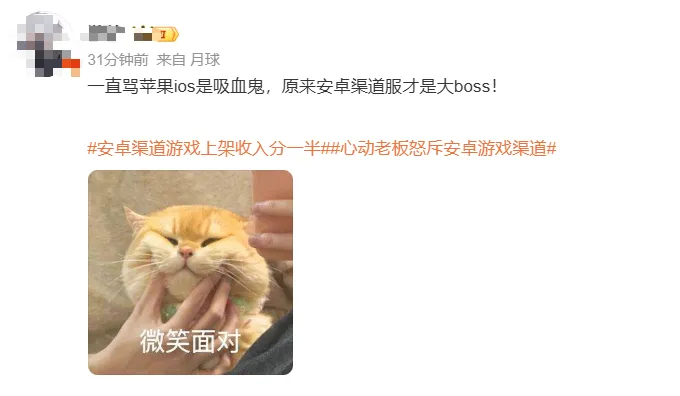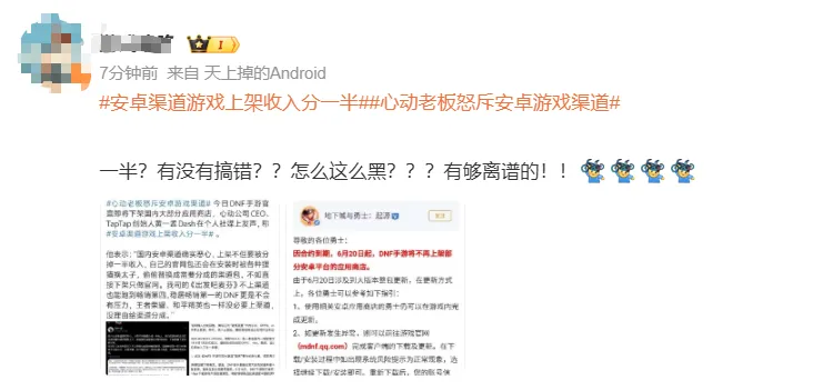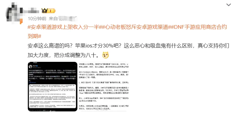 其中有一個信息點是非常耐人尋味,那就是【部分安卓渠道不再上架】,意思很簡單,就是過去上架過的部分安卓渠道到期之後,不在合作了。不少人還思考發生什麼事情之時,心動CEO黃一孟則直接在社交平台向安卓渠道開炮,表示國內的安卓渠道實在是太噁心了。